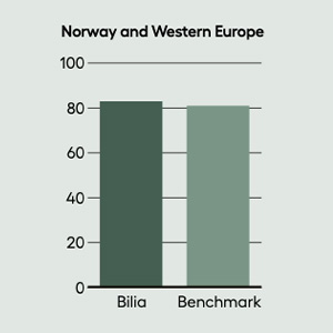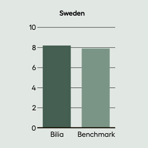 Proportion of engaged and proud employees is an important component of our internal strategy to have proud employees and satisfied customers. In 2024, we also had a higher percentage of engaged employees than the benchmark. In connection with the launch of BiliaPulsen in Sweden, different indexes are used in our countries. Sweden: 8.2 compared to benchmark 7.9. Norway and Western Europe: 83 compared to benchmark 81.